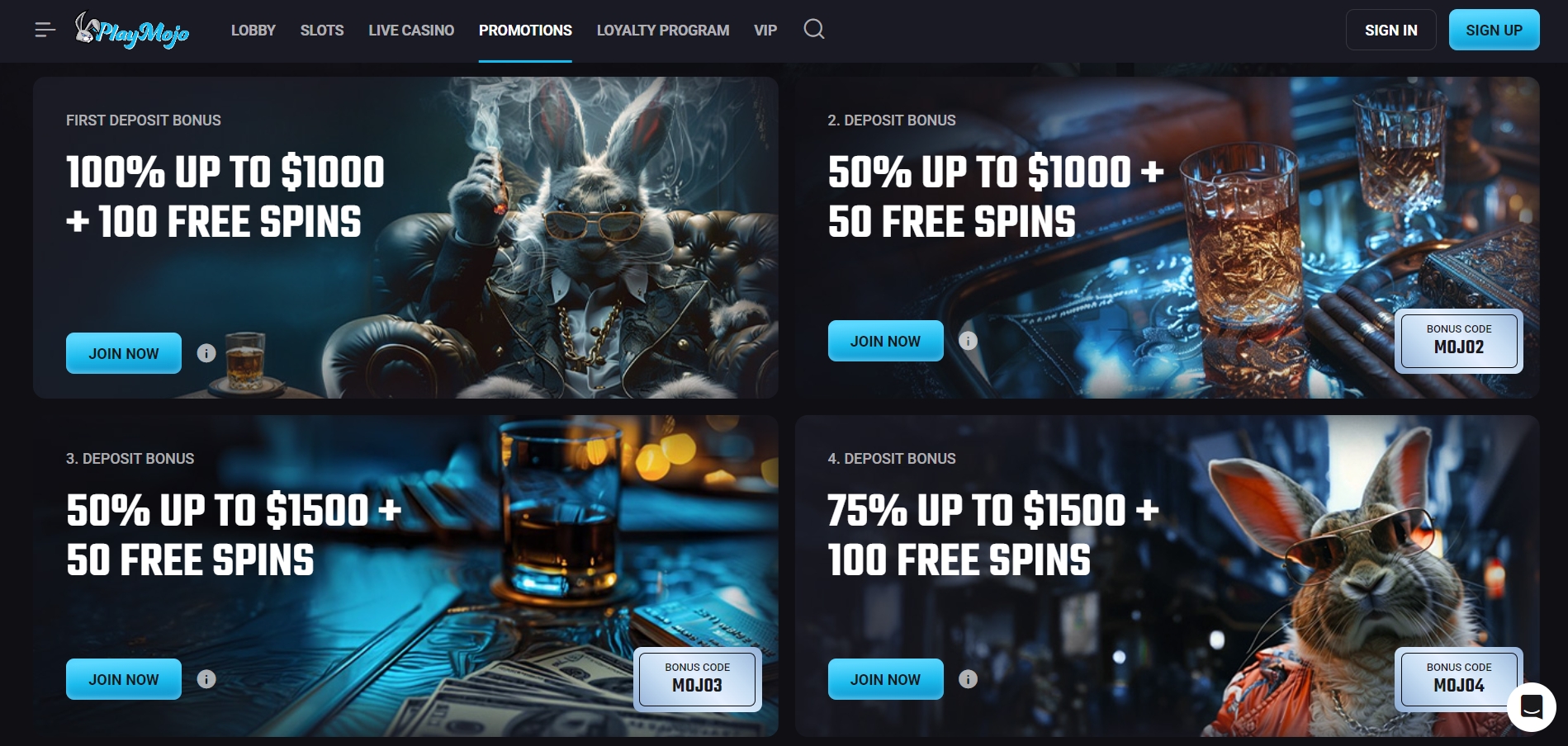 Alright, that €5,000 + 300 free spins welcome package looks tasty on paper. And it kind of is, but let me break down what you’re actually getting before you get too excited. The first deposit gets you 100% up to €1,000 plus 100 free spins. Solid start. Then things get slightly less generous: 50% up to €1,000 (deposit two), 50% up to €1,500 (deposit three), and 75% up to €1,500 for the fourth deposit. You’ll need bonus codes for deposits 2-4 (MOJO2, MOJO3, MOJO4), which is mildly annoying but whatever.